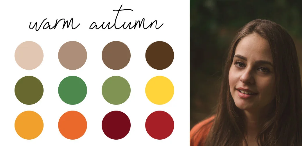 Warm seasons (Spring or Autumn) have hair and skin colors with a deeper coloring and warm, golden undertones. Your eyes may be similarly dark, but have a golden spark to the green, brown, or hazel. The color palettes for warm season types are muted but not dark or pastel, and they will have a warm tone. Both warm seasons share neutral brown bases, but the autumn palette has the medium tones we associate with Autumn like maroon red or dusty green.